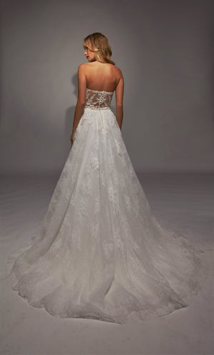Extra fabric at the back hem that sweeps dramatically behind you. Trains are available in many lengths, and can easily be cut down or altered to your desired length. Trains are particularly desirable on bridal dresses.