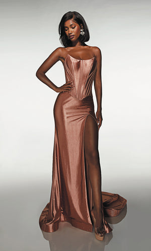 The straight/sheath (or column) silhouette gracefully skims to show off your body’s natural shape. A person with a thicker waist and wider hips will love this silhouette as it hides these flaws very comfortably. An ALYCE Paris formal straight/sheath evening dress style’s straight lines lengthen—and lend an effortless and modern air.