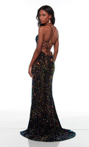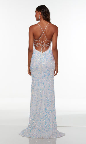 Iridescent shimmery opal color that is the key color trend for the ALYCE Paris 2023 formal dresses. Iridescent prom dress colors in magic opal and ethereal lavender for party dresses are offered in the ALYCE Paris unique signature color ‘unicorn.’ Iridescent glitter ball gowns with high heels are sure to stun at your special occasion!