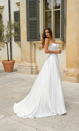 Bodice with structural boning, and a lace up back, minimizing the need for alterations, for a more perfect fit! Corsets are particularly desirable on bridal, ball gown, grad or debutante dresses as they ensure a custom fit.