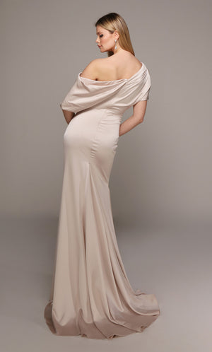 The stunning neckline on off the shoulder prom dresses put the focus on the collarbone and shoulders, and frames your face beautifully. Typically, this formal occasion ball gown style will be straight across the upper chest or in a sweetheart shape, with wide straps/sleeves hitting just below the shoulders. It works best with body types that don't care if your arms can raise up while on the dance floor.